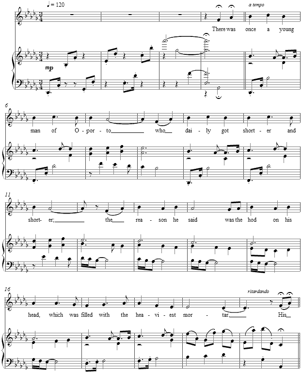 As the "young man" grows shorter and shorter, the successive sevenths where more usual octaves in the opening gesture create a quixotic introduction. This feature begins the accompaniment proper, as well, in a bass line of successive sevenths as "shorter" than the octave. The sister's tragic-comic tale carries on the family tradition as a simple second verse.