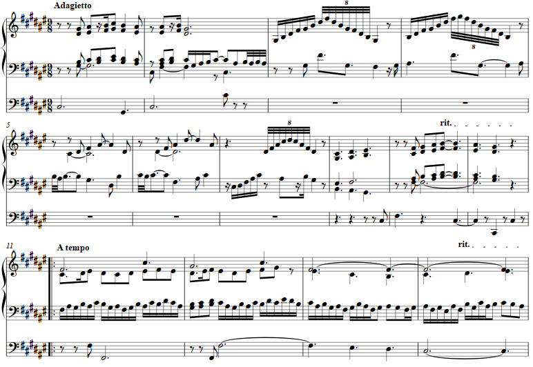 A simple parallel gesture is answered with arpeggios as introduction to a melody with a busily decorated accompaniment. Several statements at the tonic and mediant give a quasi-hymn structure to the movement. Registrations and dynamics throughout are not marked, leaving this to the player and instrument.