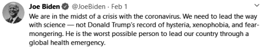 And so the question: can a politician be xenophobic or a fear-monger against Chinese Communism? And for this, apparently, Jennings writing for CNN states, "Of course they want to impeach him." But Trump was acquitted. So, a next step is to level the accusations of "hysteria, xenophobia, and fear-mongering," a "partisan fever to whip." Alas then for the partisan, a fair question is this. If Trump stands against the Chinese Communist Party, do you stand with the CCP? If not, why not If so, then are you also a xenophobe? That's how it works.... [ 3 ] This is also how it works. Prior to Trump referring to the corona virus as a "Chinese" virus, many in the media referred to it as "Chinese coronavirus" and "Wuhan coronavirus." This was apparently not "racist" on their part, and yet once Trump took up the phrase, it became "racist." Media - racist until it's not The media itself noticed: "Before the media's fake outrage, even CNN called it 'Chinese Coronavirus'." In "Biden accuses Trump of 'xenophobic fear-mongering' over 'Chinese virus' remark," by Erica Davies and Danielle Cinone, Sun UK, 19 March 2020. In the last presidential election when I voted by absentee ballot in California, I selected Jill Stein, for her clear anti-war statements. Of the three candidates, Clinton, Trump and Stein, Clinton was the obvious "war candidate," while Trump was a wild card, and Stein clear about this position. Stein carried a meager 2 percent of the vote. Apparently my view can be quite in the minority. One might consider A Modern Observation on The Anti-War Movement, Trading Places - "It just depends on who does it." Biden served as Vice-President to a wartime president, as did Clinton as both Senator for New York and Secretary of State. Boom. Elect war candidates as long as the optics are correct? "...to break the elite. Of course they want to impeach him." That's how it works. | | |