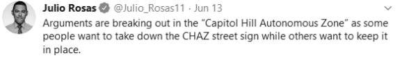 Addendum of Naming: "First, some of the left-wing activists who inhabit the so-called Capitol Hill Autonomous Zone (CHAZ) in Seattle are reportedly trying to rename it the Capitol Hill Occupation Protest (CHOP), and the evidence suggests it’s because they’re embarrassed. The thing about autonomy is it denotes self-reliance. Yet the Chazistanis, as they’ve been mockingly called, displayed zero self-reliance when they called the Seattle Fire Department late Thursday to help them with a dumpster fire." In "New letterhead, already? CHAZ purportedly changes name to CHOP amid infighting," by Vivek Saxena, BizPacReview, 14 June 2020.