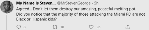 Steven George noticed enough to ask: "Did you notice that the majority of those attacking the Miami PD are not black or Hispanic kids? " One might conclude this more testimony towards "white Leftist privilege. White Leftist privilege is apparently attempting to "destroy our amazing, peaceful melting pot." So it seems, and ultimately in favor of Communism. Did you notice?