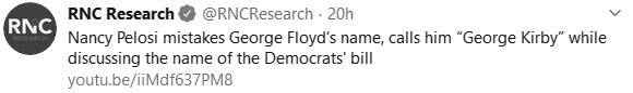 Cultural Appropriation and a Kid Throwing a fit As to the various riots which stemmed from 'peaceful' protests, one reads a black commentator's words: "It's not about black lives and it's not about police brutality. This is literally America as a parent dealing with dealing a kid that's throwing a fit. We've already tried to give you a time out. We've already tried to talk to you and now it's time to get a whipping. That's pretty much what it has come down to." In "This has never been about George Floyd," Brandon Tatum, YouTube posted video, 1 June 2020. The "fit" of which Tatum speaks is base Politics , arguing now that Everything's about my colored skin - (or sadly, Why racism works). Who? On CSPAN, Pelosi flubs the name, giving Republicans fodder. But it highlights the rhyme's opening lines -- "Let's all go to the funeral / of someone we didn't know."