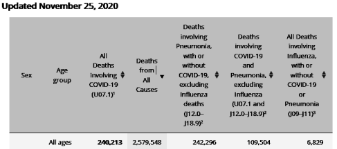 Synthesizing a Stance: The mass of media quotes above and ever changing numbers will allow the proponents of "lockdown" government to prove their right to demand of a populace, in the words of Fauci, "do what you are told." That media print "crisis" news and the whole has shifted from 14 days to "flatten the curve" to longer and more draconian acts by dictatorial governors and governments, one might well ask pointed questions of the whole divination. One observes, eleven months into this pandemic, that simple arithmetic is rarely done on obvious numbers announced, sourced from the CDC. Here is a view, in simple words and simple mathematics. In November of 2020, the CDC is tallying deaths not only from but with COVID-19. An excerpt from an ever changing bureaucratic landscape: