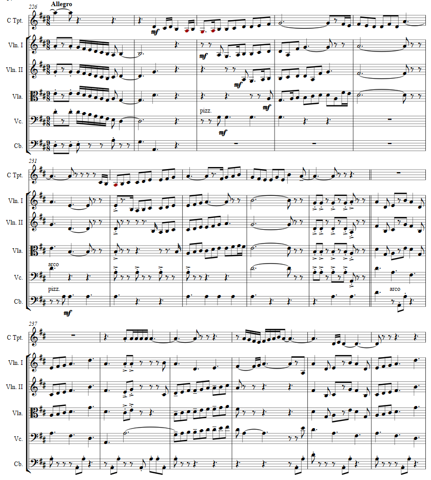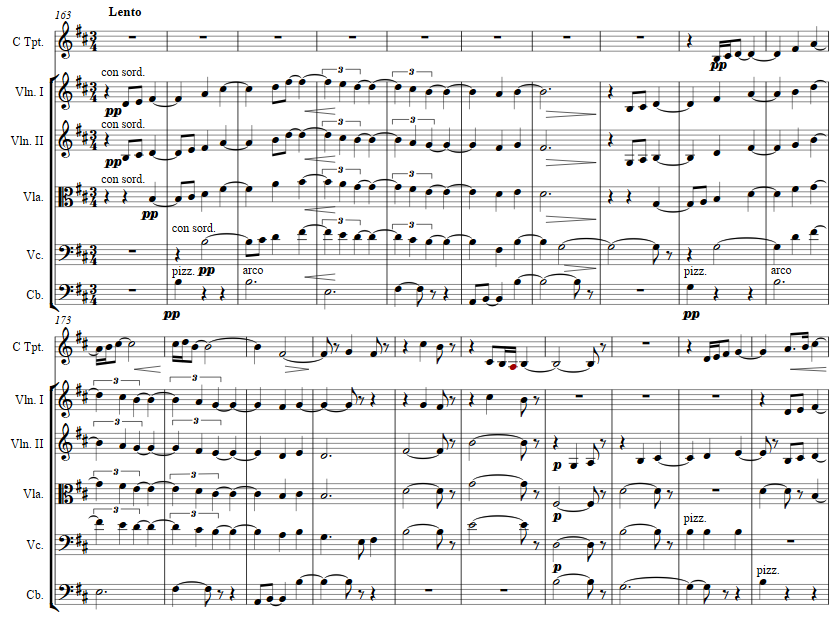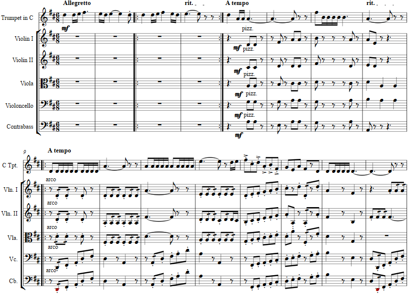 The solo trumpet calls out a piacere and then the strings join in as at measure 9 the first movement's theme is taken up.