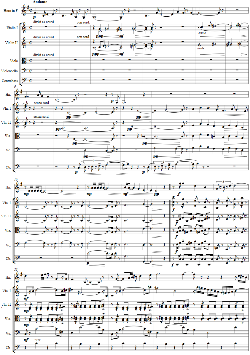 The solo horn begins the work with a simple gesture, the divisi violins responding with the four chords with the common tone, B, for C major 7, E major 7, B major 7 and G major 7. This harmonic scheme influences the work in a number of ways which are worked out in sequence. At measure 20, the principal themes of the first movement are stated forte.