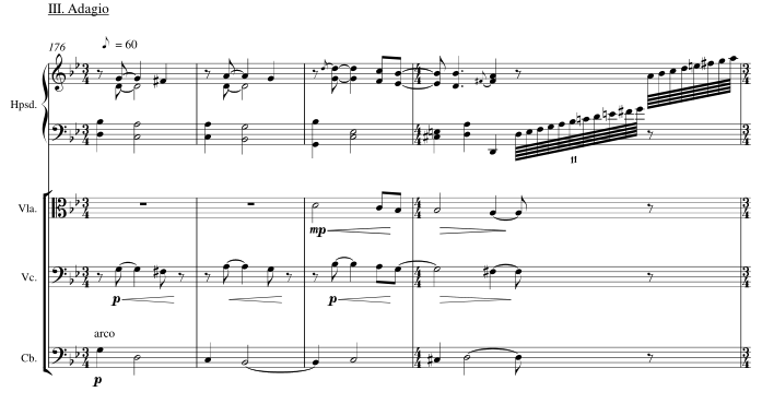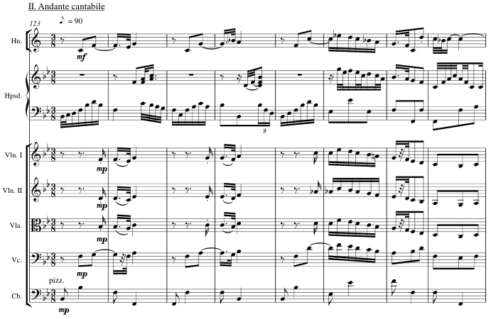 The trumpet and organ are tacet as a lyrical andante for horn embedded in the strings' parallelism trades in a second "strophe" with the violas. The harpsichord as continuo decorates.