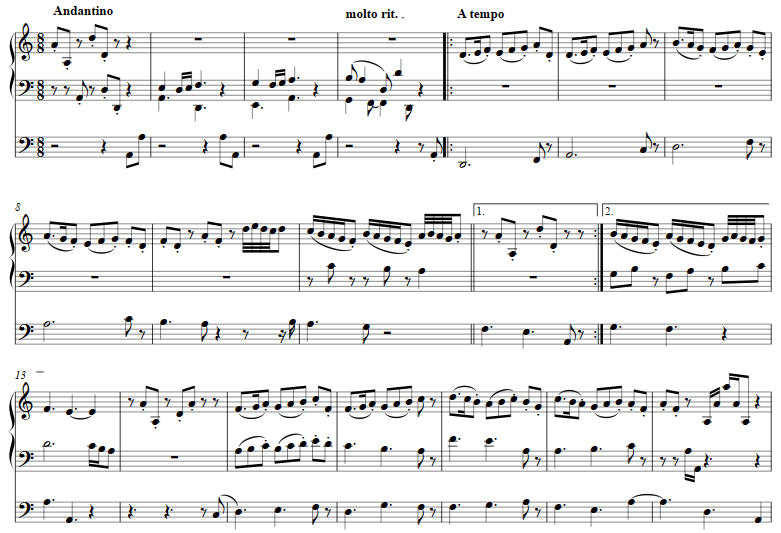 Dividing a bar into regular irregularities and titling a work in Italian is continued as these small works are fashioned. Here 8/8 is framed as 3+3+2, in a limpid, limping fughetta.