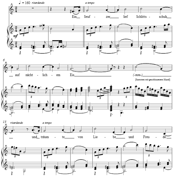 Composed for mezzo soprano and piano, the range is not challenging. Yet the vocal line is in a measured an elongated duple rhythm against the triple rhythm of the accompaniment's meter. The humming is to be an expression of delight, and perhaps irony as well.