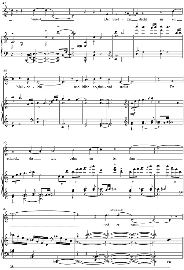 The sigh becomes "overheated" with thoughts of love and finds itself sinking into the ice, which is characterized by a change of mode in this setting, the tonic falling in upon the mediant. The opening gesture then finds itself similarly transformed, before the E of the mediant functions as the third of the dominant seventh G absent its root note, bringing the setting back to its opening gesture in C major for the summation.