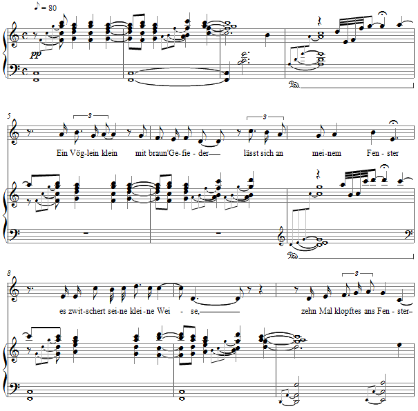 German poet and translator Bertram Kottmann has reinterpreted the text beautifully. The sparrows in Berlin sang through the late springtime, as many sparrows do around the world in their many species. The setting is gentle, very slow with the eighth note equal to 80. Throughout the diatonic dominated, and yet F is stressed throughout as well frustrating the impetus to settle in the tonic of C. The form is ABA, with the vocal part absent as the piano takes the last statements solo. At an awareness of the sense of loss brings about a harmonically altered chord, after which the sparrow's "ten" is heard again as a reminder to us all.