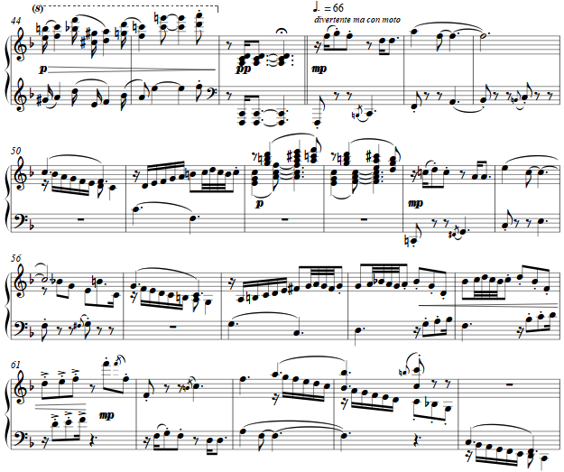 The fugue subject is accompanied throughout, and elements of the "drollery" figure into contrapuntal interludes along with polytonal colors.