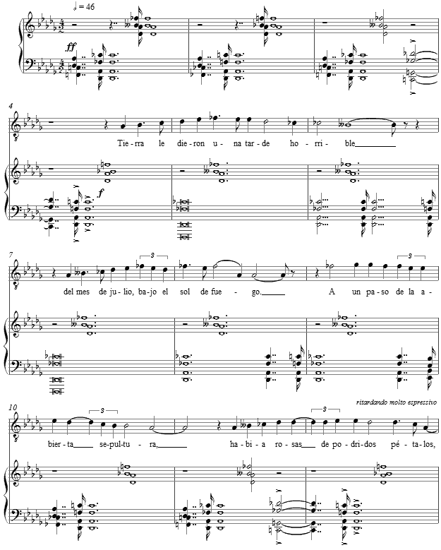 The score for En El Entierro de Un Amigo is available as a free PDF download, though any major commercial performance or recording of the work is prohibited without prior arrangement with the composer. Click on the graphic below for this piano-vocal score.