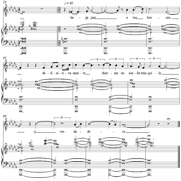 The final text becomes prayerful, and the tonality remains in the major mode and the mensural period of the accompanying chords shortens from four to three and thence to two as an image of tranquility is offered up to the lost "friend."