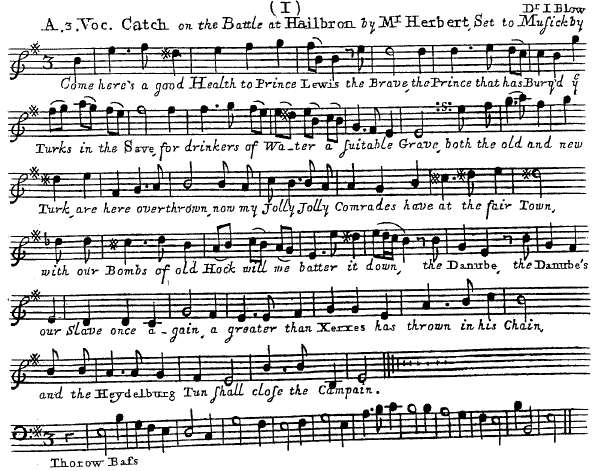 The theme is drawn from The Catch Club or Merry Companions being a Choice Collection of the most Diverting Catches for three and Four voices Compos'd by the late Mr. Henry Purcell, Dr. Blow & c. with the full title, "A Three-Voice Catch on the Battle at Hailbron by Mr. Herbert, set to Musick by Dr. I. Blow." The text for this round [ 1 ] reads: "Come here's a good Health to Prince Lewis the brave / That has bury'd cy Turks in the Save, / For drinkers of Water a suitable Grave, / Both the old and the new Turk, are here overthrown, / Now my Jolly, Jolly Comrades have at the fair Town, / With our Bombs of old Hock will we batter it down, / The Danube, the Danube's our Slave once again, / A greater than Xerxes has thrown in his Chain, / And the Heydelburg Tun shall close the Campain."