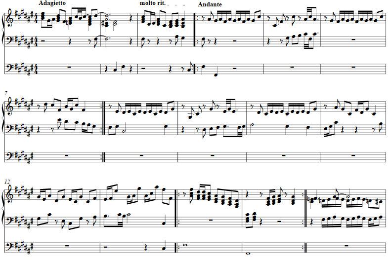 The two-measure gesture is repeated phrases is spun out with counterpoint and parallel episodic gestures.