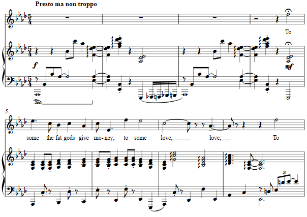 A light hearted romp in 5/4 echoes the shape and amusing typography, as the poet suggests a strophic song-form.