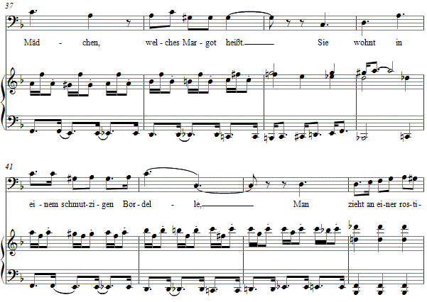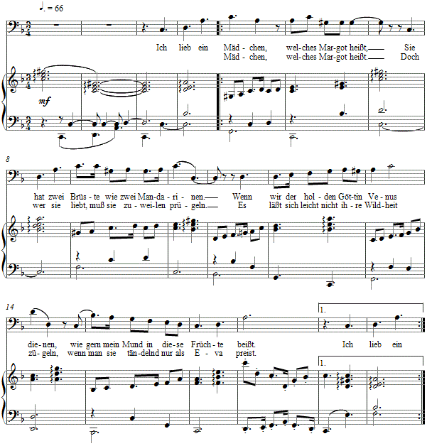 As the verses pass, the accompaniment turns more "vaudeville," the strutting dotted rhythm imposing another texture onto what would otherwise be a simple set of strophes in song. From the sexy image of breast like mandarin oranges to the citation Greek love, the verses turn downward to the brothel and thence to that ease of discarding which Klabund captures in a last dark image or two.