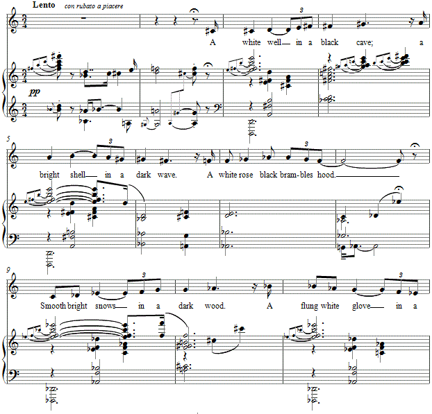 Each set of four lines is gathered by the poet into a stanza, while I chose to create verses of six lines of text as a shape variation on the whole. For this, six stanzas become four large arches with a last "button" as summary. Each large arch moves to a "distant" tonal domain, such that the structure moves as follows: D natural - D flat - C natural - D flat - D natural, and then cadences in a foreshortening of that last set of harmonic relationships. The augmented chords for the dominant slip the setting from region to region in a set of alterations like unto the text's white-black and bright-dark contrasts.