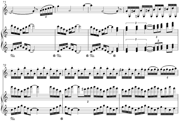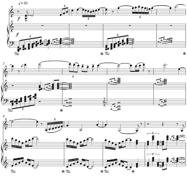 To capture the various reflections of this painting, the work opens with broad arches of the same four-note chord over which a florid violin rises and soars. Wholly diatonic, it is set apart from later scales with their augment seconds which one often associated with music of the Ashkenazi musical traditions. A few triadic harmonies linger over many measures as the violin essays lines above. The score is intentionally under-marked with forte only to remind at each section to reset the dynamics; interpreters may feel free to alter as they see fit for the instruments and venue.