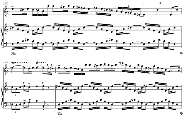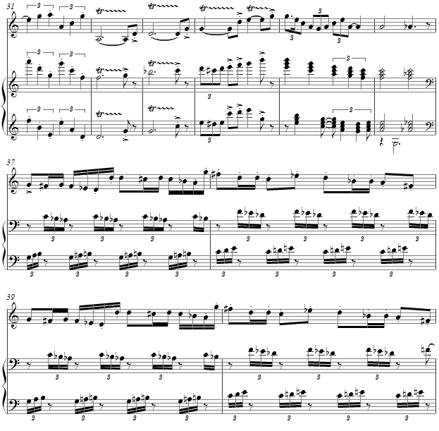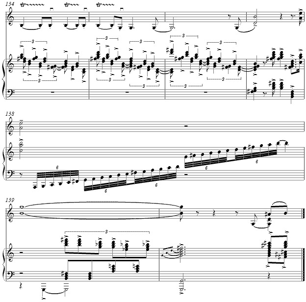 The coda to the piece revisits the arppegiation of the single, four note chord against the insistent trills of the violin, with a final, polytonal brushstroke before the final chords and resolution into what proves to be G major, though no key signature is used for the many regions into which this short work fall.