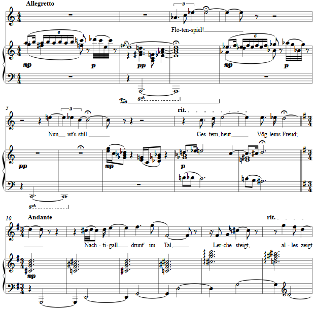 As with the continual change of colors as spring blossoms into its bright palette, the three stanzas of the text move through changing tonalities as well as small changes in the accompaniment's figurations and vocal line.