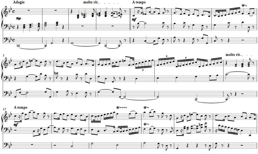 The lowered third and raised sixth mix with the lowered leading tone appearing at the end of the gesture, giving this mode its distinctive signature and fugue subject its shape. The accompanied fugue moves between the expected tonic and dominant relationships with various episodic gestures as contrast.