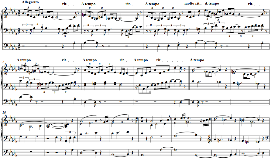 A subject's harmonic implications is worked in rhythmic and textural variations, broadening the definition of a fugue subject into multiple voices acting as a unit.