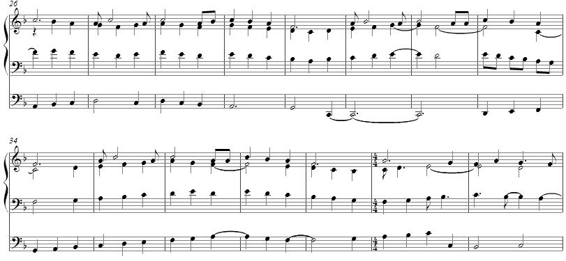 The final statements of the theme are variant melodic forms and the underlying accompaniment begins with parallel second-inversion triads, as the third and seventh of the scale are sometimes flatted extending the implications of a more ranging tonality.