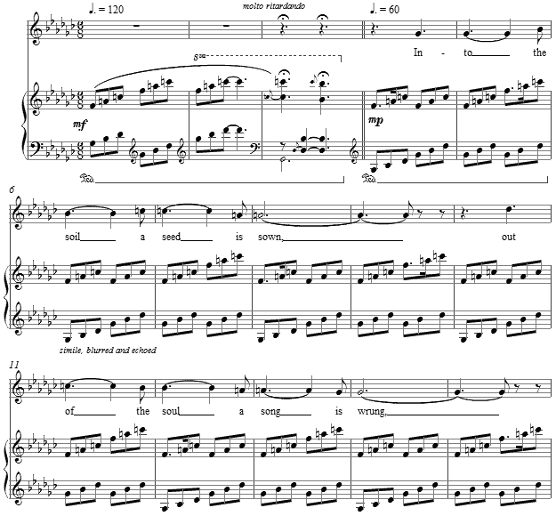 Composed for medium voice, the majority of the setting is minimalistic and harmonically static, a sustained single bitonality of F major over G flat major. the vocal line participates in both tonalities by its scalar references, rooted in G flat with the raised second and fourth of the key signature. The accompaniment is intended, as marked, to be "blurred and echoed."