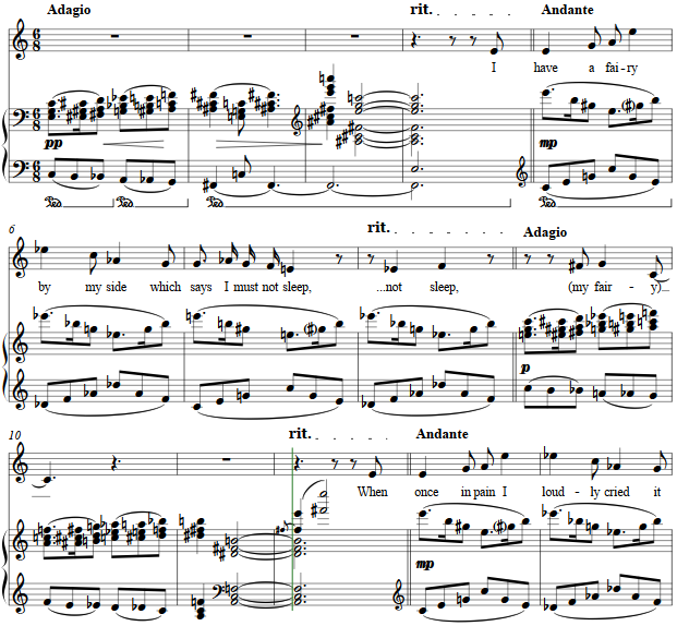 The contrary motion of the rising parallel triads and descending bass line meet at the tri-tone. The short stanzas are flavored with polytonal relationships, with changes of tempi throughout.