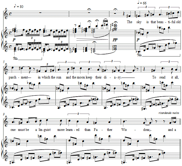 The imagery of "old parchment" paired with characters as fanciful as Father Wisdom and Mother Dream suggested a minimally polytonal setting, sweetly consonant in a dissonant way, colors and gentle rhythmic gestures to transport one to a land of metaphors and sense memories. Two large gestures make the whole of the setting. The first is the opening wash of polytonality, and the second is a slowly changing progression of only four chords, referring back to the opening gesture. A final play off for the piano alone brings a setting sun to this "sky."