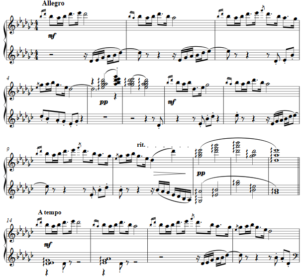 A traditional Irish tune has the lyrics, "Dilín ó deamhas ó deamhas / Dilín ó deamhas ó dí / Dilín ó deamhas ó deamhas ó deamhas ó / Dilín ó deamhas ó dí" and from the Gaelic is sometimes translated as "Little darling, oh angel, oh angel, little darling, oh angel, oh darling...." The opening word is of two parts, "Díl" as term of endearment, and suffix "ín" meaning "small" or young, while "deamhas" is "angel." The tune is repeated with varying, sparse counterpoint and then restated as a fugato for the joy of it. As a pentatonic melody the "black keys" of G flat major was chosen.
