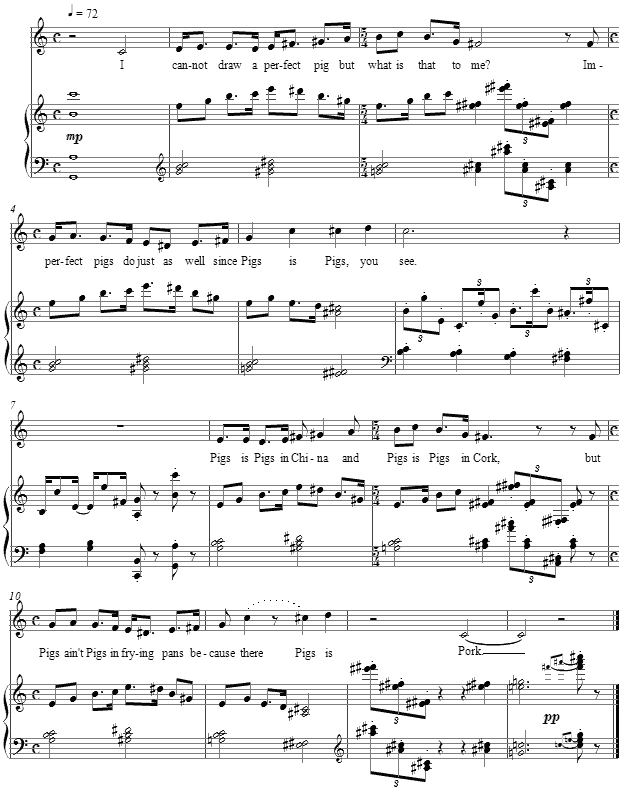 In a recital or for simple amusement at a party, a short, disarming and unexpected "throw away" such as this can be useful. This silly setting comes to the dark conclusion that "pigs is pork," the grammar purposefully incorrect as a form of Americana patois. The setting ostensibly in C revolves around C major seven moving in succession -- as opposed to a progression in the sense which Schoenberg outlined in his Structural Functions of Harmony -- to E major seven and again E to F sharp major seven, the functional "dominant" being made from the tree of ninths as in measure 1 and 7. The melody's shape is enforced by the underlying harmonies.