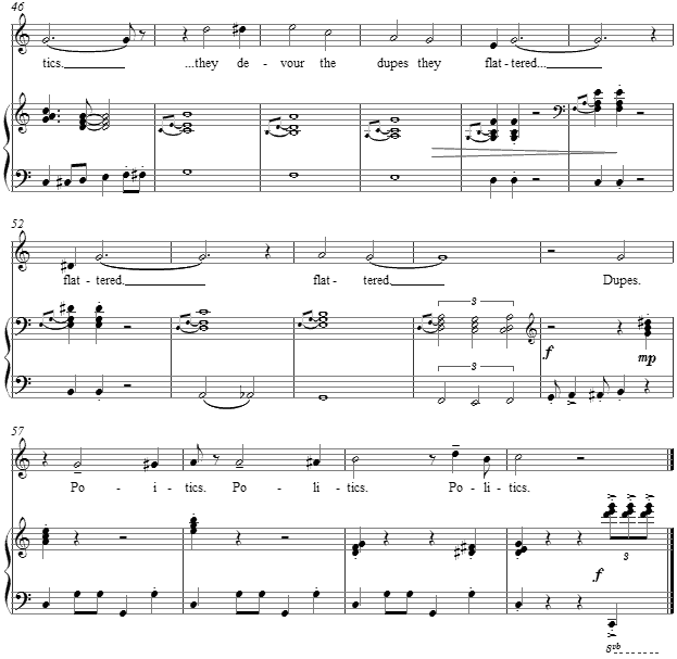 The score for Politics is available as a free PDF download, though any major commercial performance or recording of the work is prohibited without prior arrangement with the composer. Click on the graphic below for this piano-vocal score.