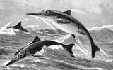 NOTES [ 1 ] In 1867, the idea of prehistoric creatures in general was novel, especially so with the Ichthyosauria or Ichthyopterygia or "fish flippers" - a designation introduced by Sir Richard Owen in 1840. Ichthyosaurus was the first complete fossil to be discovered in the early 1800's by Mary Anning in England. It was therefore quite the leading edge in science to be involved in such studies, and romanticized by the media of the day as well. Vischer is therefore understandably misinformed about what became known of this species; they were "giant" marine reptiles that resembled fish and dolphins. The representation pictured here comes from a 1916 series of German collector cards titled, Tiere der Urwelt. Early in the theorizing about this species it was believed that they were aquatic creatures who came onto land to breed and bear their offspring, which perhaps explains Vischer's delightful image of the "nuptial bed" of two such creatures. |