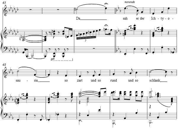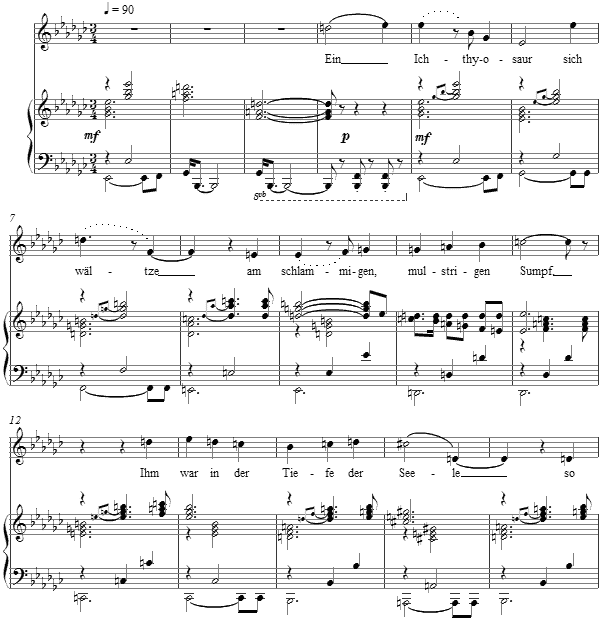 This nonsense was a delight in the period in which Vischer worked, as other German poets also added to the fund of humor. In this case, the picture of the Ichthyosaur is truly nonsense, as it was based on rudimentary discoveries of that time. To contrast the silly "alpha and omega" of this poem, it begins in a dense E flat minor, as the harmonic progressions move often chromatically. It is a gentle waltz, a pun on the similar verbs "wälzen" and "walzen." ( To waltz as opposed to roll about, though I imagine some dancers lean towards the second verb at times.) The break in the words' vocal line is meant to over-dramatize this strange yet savory picture.