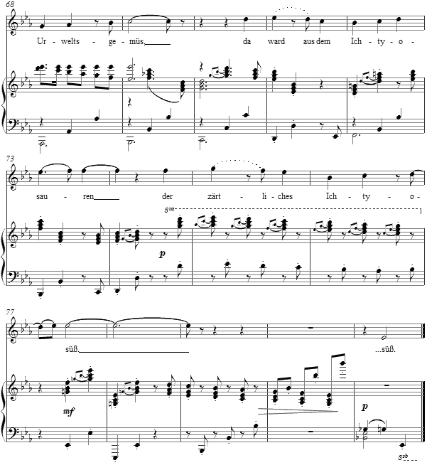 The image of two prehistoric creatures being "sweet" as Vischer writes is itself amusing. For this the highest range of the piano tinkles it message that this love making was "zärtlich." Sweet, as the song ends with the last syllable of Vischer's inventive pen.
