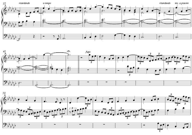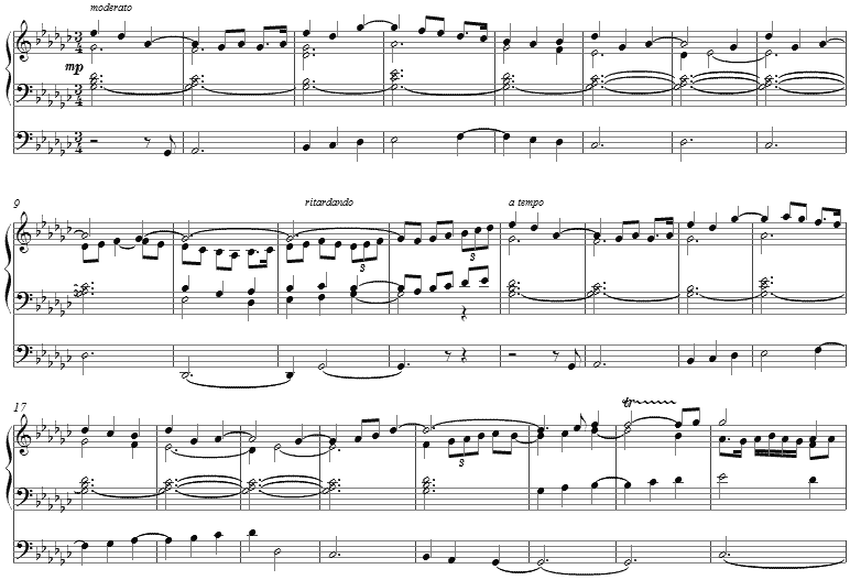 This short lyrical prelude is composed over an extended tonic pedal in the lower voice in the manuals. Above and beneath the long held G flat, soprano, alto and bass voices rise and fall to meet one another in a pleasant instrumental motet of sorts.