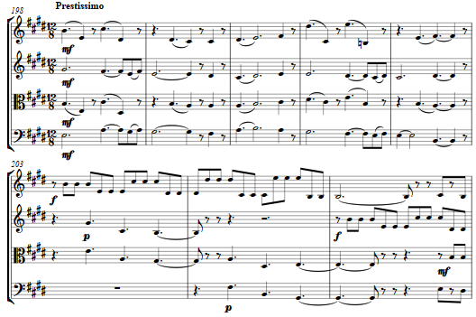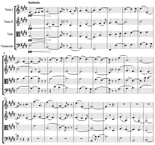 The quartet is in five movements, identified by tempo markings. A choral-like opening leads to a jaunty 6/8 dialogue for the voices, followed by a motet of crossing voices in short canonic phrases, a meditation moving from a somber C major and back into E, and a final long fugue.