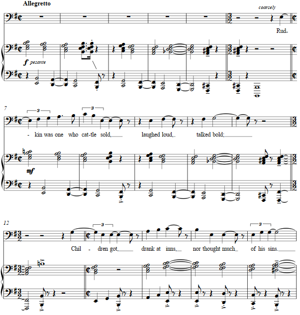 Marked pesante in the accompaniment and "coarsely" for the singer, the setting is intended to convey the rude and lurching scansion of the poem and its central character.