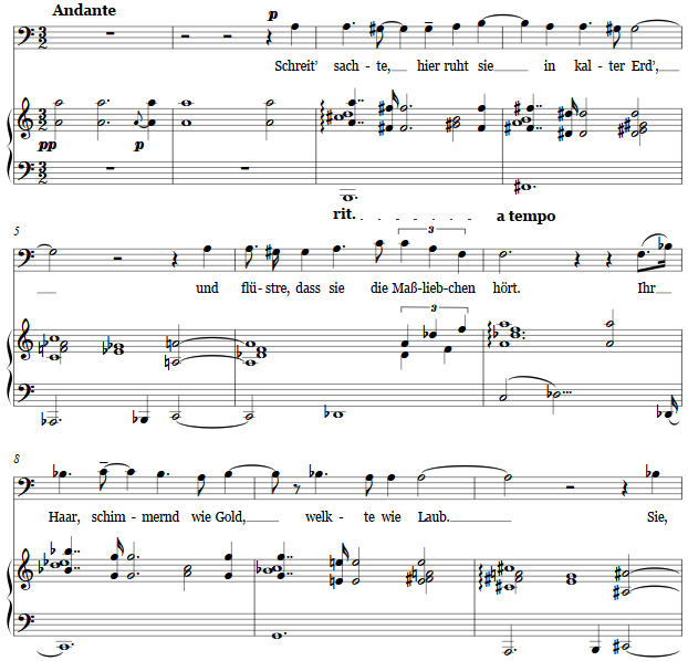 The excellent translator, Bertram Kottmann, sent me this text among his translations. Somehow in some instances, his words and sensitivity move me musically in a way perhaps other than he might have intended. To me, this text while most assuredly related to Wilde's also speaks in other colors. Therefore his text suggested a different setting, moving through soft dissonances to more distant tonal domains. As I listened to Bertram's text, the setting composed itself. For other settings of Kottmann's texts, click here.