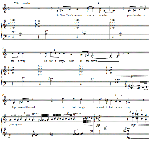 A hushed opening adds the raised fourth to the C major tonic, and implies the arch in D major which follows in a marked poco agitato. Kottmann suggested a "klein Form," and this form is a set of gestures in C, then D and a return to C, C followed by D again, and a final more rhapsodic moment which cadences finally in E major. Time, as the turning of the year reminds, moves us "from and to." Time passes, as the text reminds, into a "yesterday so far away."
