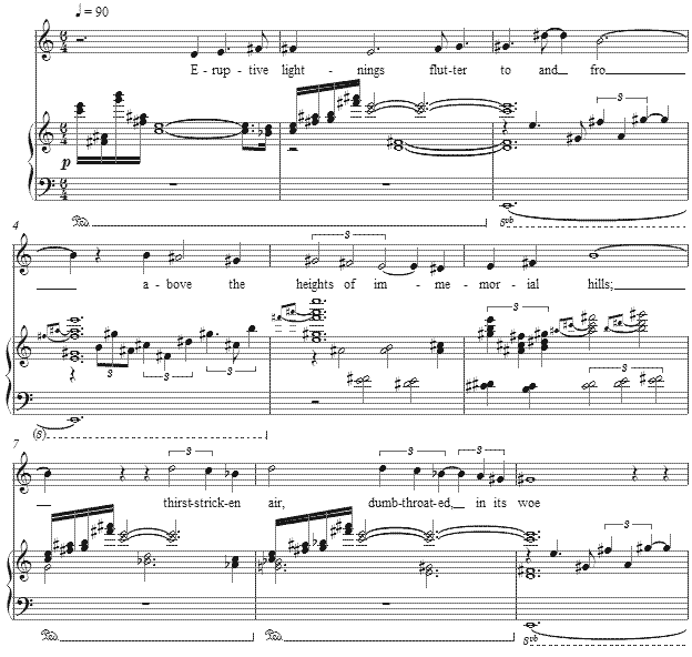 The setting, intended to be performed wholly in shades of piano and softer, moves back and forth between whole tone scales, some light polytonality through the whole tone use, and a brighter E major. The vocal line rises slowly through the minor third to arrive thereafter at the major third and then the major seventh of the scale, in a small act of brightness against the opening whole tone gestures.