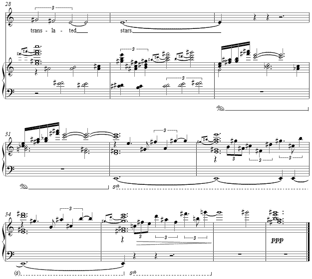 The text is broken into parts, such that there becomes a repeat A section, and a final lingering piano postlude concludes the meditation on "summer silence" and the "stars" as Cummings paints their "untranslated" images.