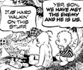The music hall style, mixing duple against triple rhythms, vanishes, as an accusatory tone is taken up resting on the often repeated augmented triad in the accompaniment, as the harmonic rhythm stands still, enabling us to emphasize the reminder that we fail to notice so much, all the while the ego "discloses all things that a Quoodle can." Even so, we are the Quoodle in Chesterton's words and therefore we so often our own worst and best enemy, just Walt Kelly's American comic character Pogo [ 1 ] reminded that he has met the enemy, and 'he is us' -- Chesterton reminds that we "haven't got no noses," and with this he descends into coarser, ungrammatical speech to emphasize this, repeating it.