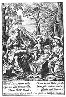 The original Latin text is found at the bottom of an engraving by Hieronymus Wierix (circa 1553-1619), a Flemish artist, and is titled "The Virgin Sewing While Angels Rock Her Son to Sleep." It is now held in the Harvey D. Parker Collection.