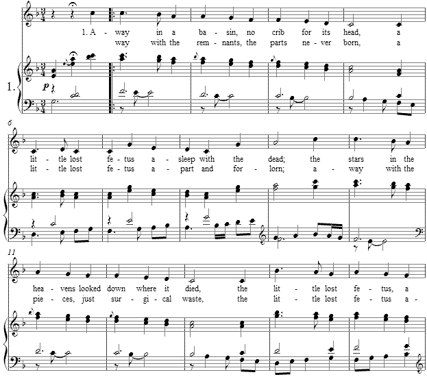 The score for Three Abortion Carols is available as a free PDF download, though any major commercial performance or recording of the work is prohibited without prior arrangement with the composer. Click on the graphic below for this piano-vocal score.