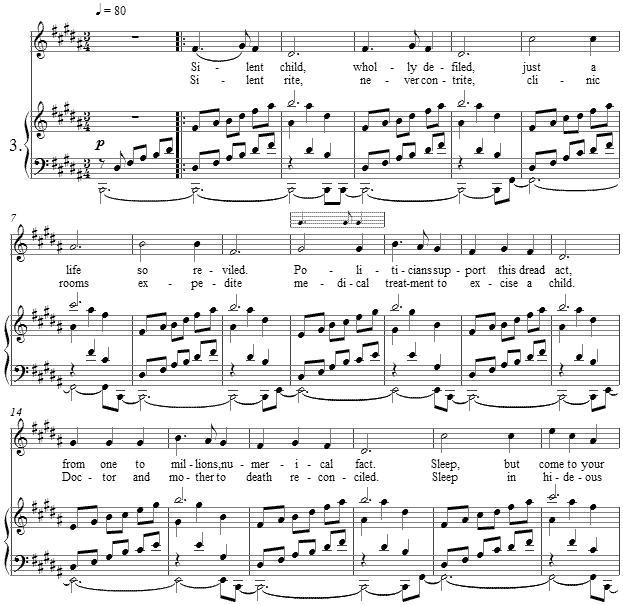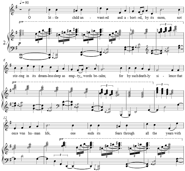 Rather than the image of a "silent night" and "holy night" which those Christians who merrily celebrate as harbinger of a the "holy infant so tender and mild," I place the aborted fetus, the new and justified image of those who speak their credo of "pro-choice" alongside their credo of a "holy infant." The cognitive dissonance to these cultural images is writ large in modern politics. [ 4 ] The simple harmonic changes are spread across harp-like arpeggios and should be softly blurred with pedal.