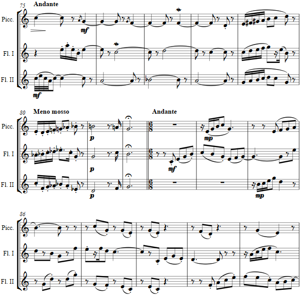 An andante of longer lined themes is taken up, moving through a harmonically distant tonal region. again with counterpoint in canon at times.
