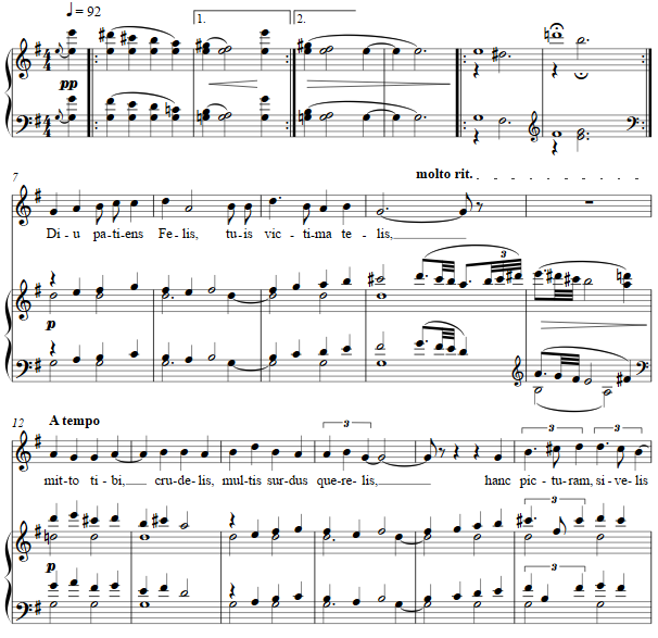 The texture of the opening suggests perhaps distant bells, in a lightly polytonal color. For the Anglican flavor to those in Carroll's circle of that time, a chant-like melodic line intones, before becoming more intense and comical at its "meowing" end.